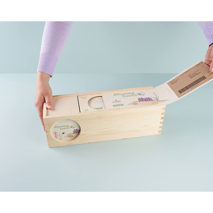De Blooms & Bees heeft een uniek ontwerp. De robuuste houten Box is niet alleen een slimme pot voor de planten, maar het is ook meteen de verzendverpakking. Zo besparen we jaarlijks een enorme berg verpakkingsafval. En doordat de planten zichzelf water geven geniet je lang van je fleurige vrienden in de CO2-neutrale BloomsBox!